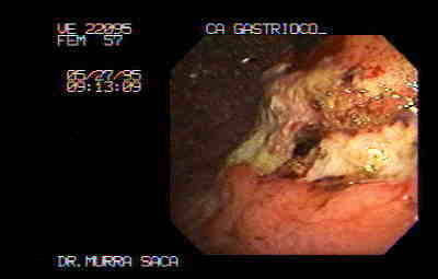 Carcinoma Gástrico que ha infiltrado toda la cámara gástrica, se observa el cardias por retroflexión el cual es infiltrado por dicho carcinoma parte negra es el Endoscopio.