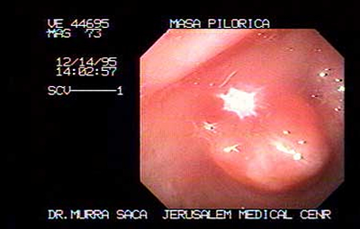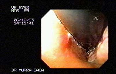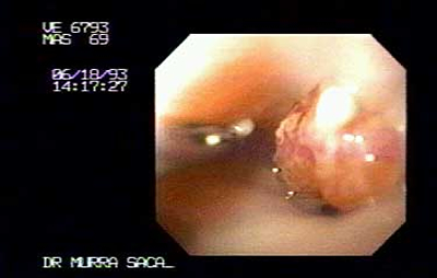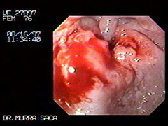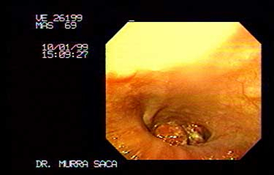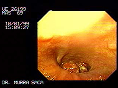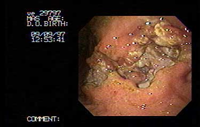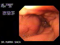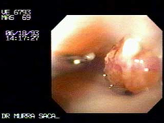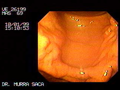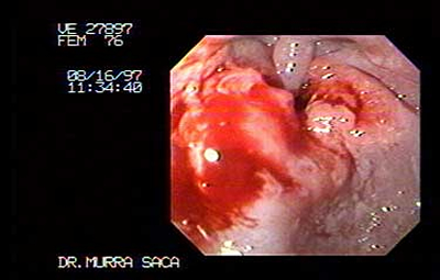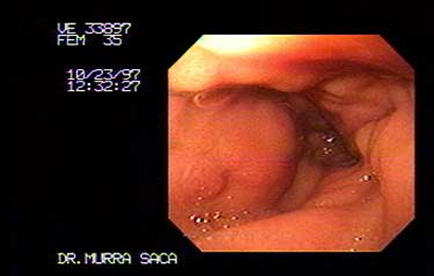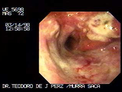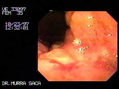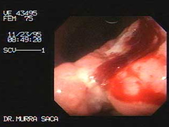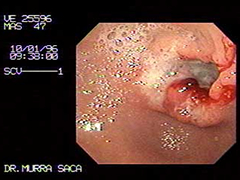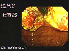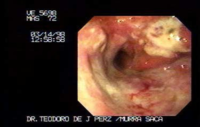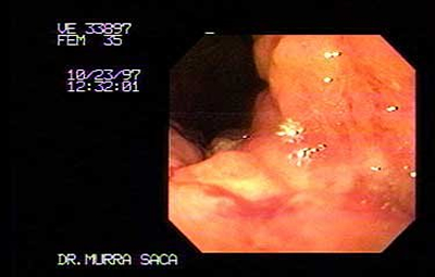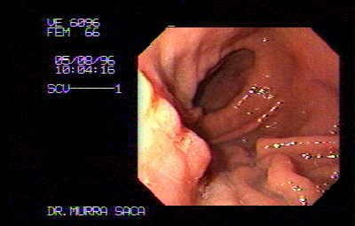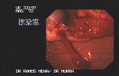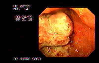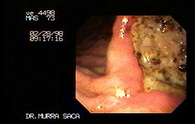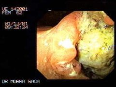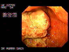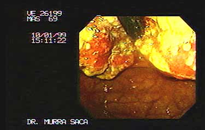 Hermano de prestigioso Cirujano Pediatra de El Salvador. El cual me solicita que le practique este estudio, le diagnosticamos este carcinoma obstructivo, la imagen endoscópica de control, Fue después de un año de habérsele diagnosticado por lo que Se le había practicado una derivación en omhmeda por haber sido irresecable al intento quirúrgico es de notar que esta imagen endoscópica es después de haber recibido quimioterapia y radiaciones con Cobalto.