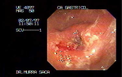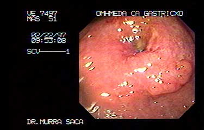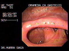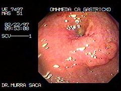 Con imagen endoscópica de carcinoma del cuerpo gástrico. Se observa el endoscopio en retroflexión.