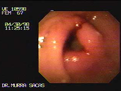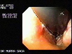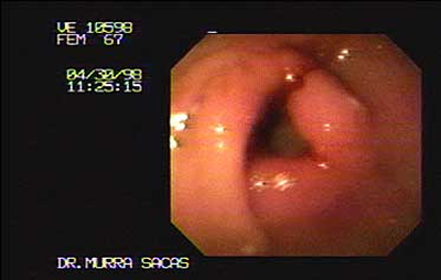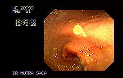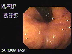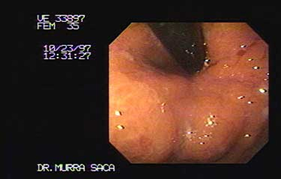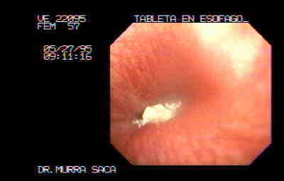 Quien había tenido antecedente de dos endoscopías previas en distintas fechas en un hospital nacional y otra endoscopía por médico privado, la tarde anterior del examen se le detectó una infección severa de vías urinarias, se le prescribió Ciprofloxacina oral. Dicha tableta fue ingerida a las 3 de la mañana, la hora de este examen aparece alas 9 horas once minutos, la tableta todavía está en el esófago lo cual no es normal ya que los alimentos y medicamentos pasan de inmediato al estómago por lo cual se sospecha que hay enfermedad en esta región. Ver fotografías siguientes.