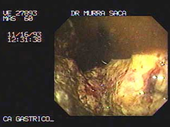 Quien ha tenido larga historia y tratamientos multiples para dispepsia inicio sintomatología obstructiva por lo que consultan con medico general, quien inmediatamente me localiza vía telefónica para que le practicáramos este estudio. Extenso Carcinoma Gástrico que obstruye antro e infiltra extensamente el cuerpo y fondo.