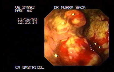 Imagen endoscópica del mismo paciente descrito anteriormente con extenso carcinoma de cuerpo y antro.