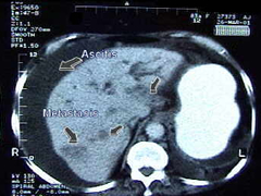 Se observa ascitis y metástasis hepáticas., lo que significa que dicho cáncer ya esta diseminado, encontrándose en fase muy avanzada.