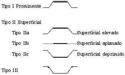 Este diagrama muestra las diferentes formas del carcinoma gástrico temprano el cual es solo limitado a mucosa o sub mucosa.