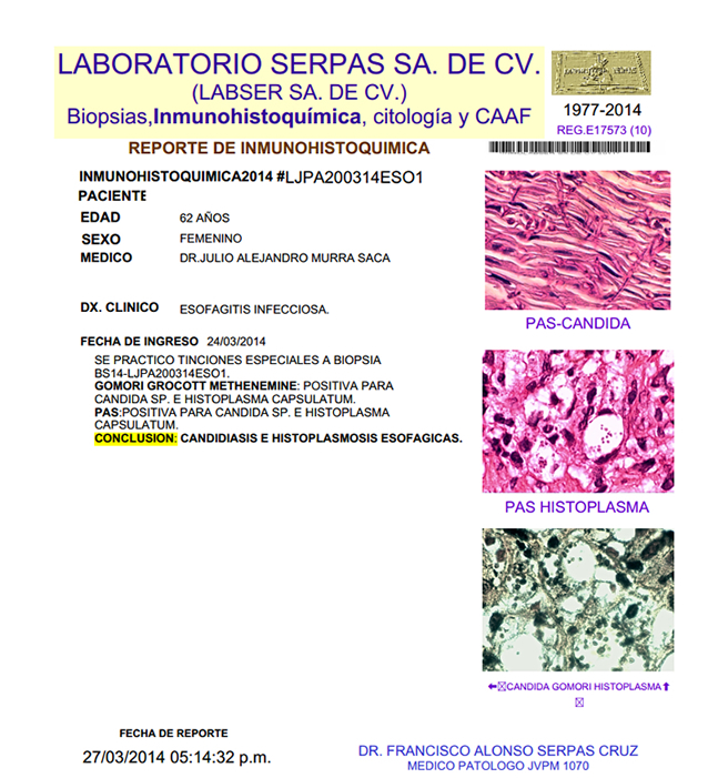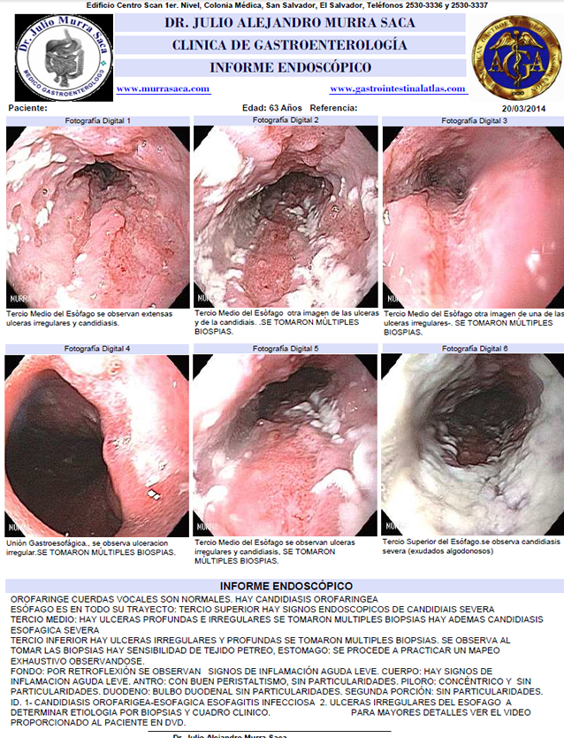 observando ulceras largas y profundas del esofágo asociado con candidiasis severa de orofaringe y esófago